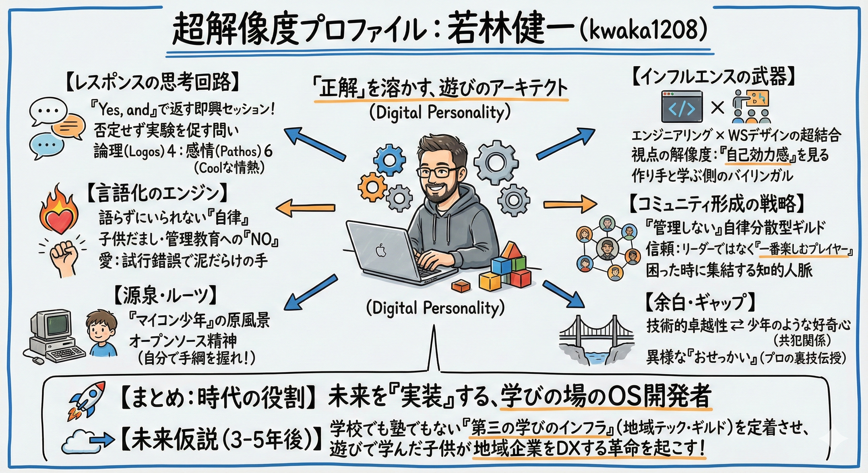 知的人脈: CoderDojo、Maker Faire、Open Source界隈など、利害関係ではなく「好き」で繋がった強固なネットワークを持つ。これらは「困った時に助け合う」実働部隊として機能しており、彼が旗を振れば、各分野のスペシャリストが即座に集結するポテンシャルがある。
