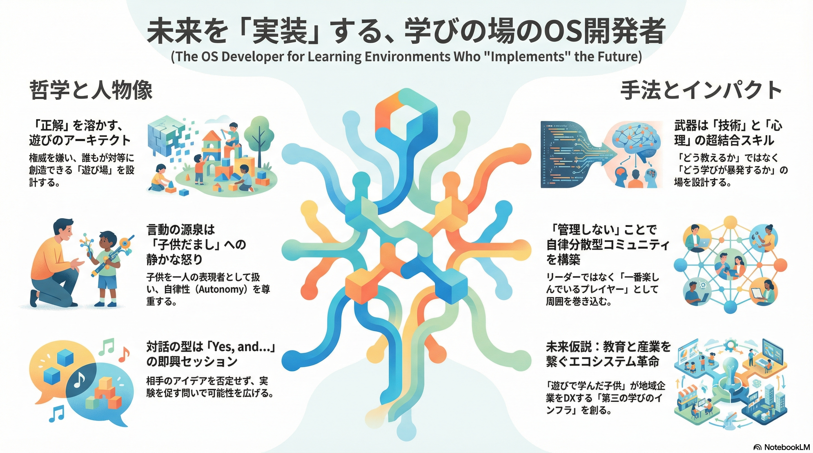 表向きはプログラミング教育やコミュニティ運営だが、彼が注ぎ続けている真のエネルギーは「社会教育システムのバグ修正(デバッグ)」にある。 法人化(Crossroads Inc.)をテコに、ボランティアベースの活動を持続可能な「事業」へと昇華させ、公教育や企業研修のあり方を、外側からハックして書き換えていく準備が整いつつある。
