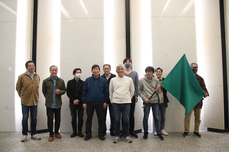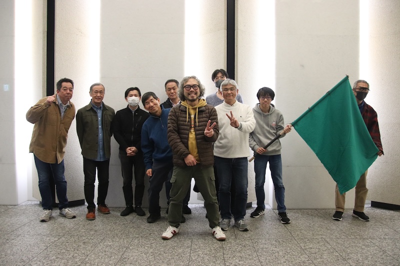 主催者(私)に集合写真を撮る習慣がないので、みんなで写真を撮らなかったのが心残り。最後におじさんたちだけで撮った写真を載せておきます。この日のために作った緑の旗も最後にみんなの写真撮影スポットになってました。